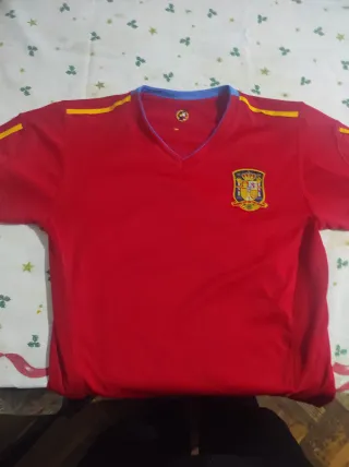Camiseta oficial de la selección española para niño, talla 12,sin número - Color rojo. - Escudo de España en el pecho. - Detalles amarillos en los hombros. - Cuello azul.