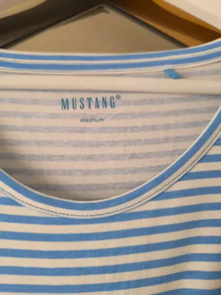 Vendo camiseta de manga larga y cuello redondo, tiene estampado de rayas horizontales marineras en azul oscuro y blanco. En la parte inferior de la parte delantera tiene una tela bordada o lencera. Talla M de mujer. Las medidas de la prenda son: - De sisa a sisa: 53cm - Largo de la prenda: 58,5cm