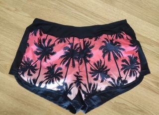 Camiseta deportiva Crivit con estampado de palmeras talla 38-40. Short negro con estampado palmeras y bolsillo cremallera y malla interior talla 42. - Diseño con cuello redondo. - Tejido transpirable en la espalda. - Detalle de palmeras en la parte frontal.