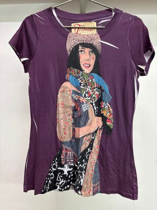 Camiseta de manga corta con un llamativo estampado frontal. - Diseño multicolor con una ilustración de mujer. - Base de la camiseta en color morado.