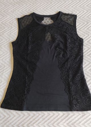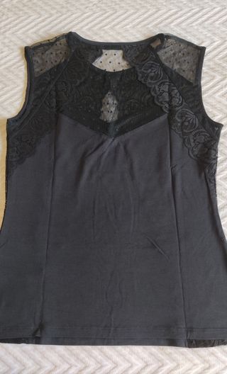 Elegante camiseta sin mangas de la marca Morgan. Presenta un diseño con detalles de encaje y transparencias. Nueva, sin uso. - Cuello redondo. - Panel frontal de encaje. - Detalle de encaje en los hombros y espalda. - Tejido principal opaco. Más prendas en mi perfil!!!