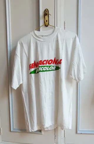 Camiseta blanca con el logo "Sensacional Fujicolor". - Diseño gráfico llamativo. - Cuello redondo y manga corta. - 50% algodón/ 50% poliéster