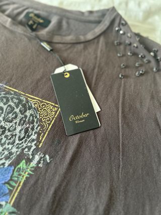 Camiseta October, para mujer, en color gris oscuro, con detalles de pedrería en los hombros. Nueva a estrenar con etiquetas.