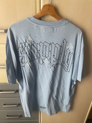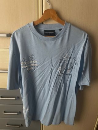 Camiseta de manga corta con un diseño gráfico llamativo en la espalda. - Estampado con letras góticas y cruces. - Color azul claro. - Cuello redondo.