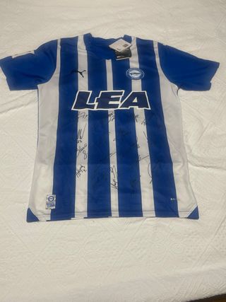 Camiseta oficial del Alavés FC con firmas de todos los jugadores. - Diseño a rayas azules y blancas. - Logo del club en el pecho. - Tecnología DryCell.