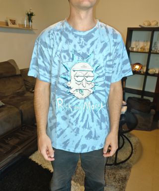 Camiseta con estampado de Rick and Morty en estilo tie-dye. - Diseño de Rick Sanchez pixelado. - Estampado Rick and Morty en la parte frontal. - Patrón tie-dye en tonos azules y grises.