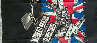 Camiseta negra con diseño de los Sex Pistols. - Diseño frontal con la banda y la bandera británica. - Cadena y candado en el lateral izquierdo. - Estampado con Not Dead, Punk's, Sex Pistols y Anarchy in the U.K.