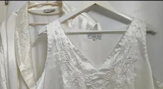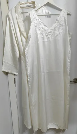 - Bata y camisón a juego. - Vintage años 80/90. - Marca Lady Diana. - Talla 40, son amplios. El camisón mide 55,5 cm. de ancho en la sisa. - Conjunto clásico y elegante. - Camisón con escote de pico bordado. También el bajo, en ondas. Caída recta. - Tirantes ancho. - Tejido suave y liviano, con brillo. No trae etiqueta de material. - Bata con similares bordados en las solapas. Ata en el interior con un pequeño botón forrado de tela satinada, una cinta interior en lazo y cinturón ancho por la parte exterior. - Lleva hombreras, no muy grandes. Se pueden quitar descosiendo. - Todo en un mismo color blanco roto/crema.