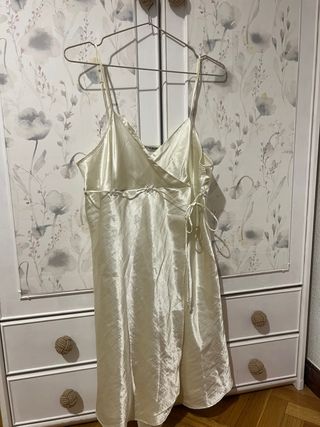 Precioso camisón de raso, ideal para una noche romántica. Es de color beige y tiene un corte favorecedor. - Es un vestido tipo camisón. - Está hecho de raso. - Tiene un diseño de envoltura. - Corte al pecho con lazo y flores