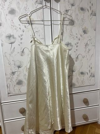 Bonito camisón de satén con detalles de encaje. - Tirantes finos ajustables. - Adorno de lazo en el escote. - Tejido satinado suave. - Desde el pecho hace 51cm. - Nuevo, nunca usado. - Talla L pero talla pequeño, es como una M.