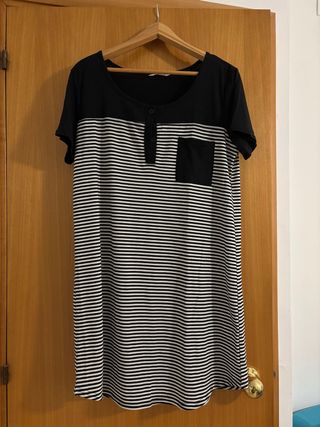 Camisón con diseño de rayas horizontales y detalles en negro. Ideal para lactancia. - Cuello redondo con botones. - Bolsillo en el pecho. - Corte midi. - Cómodo y fresco. Nuevo sin etiqueta.