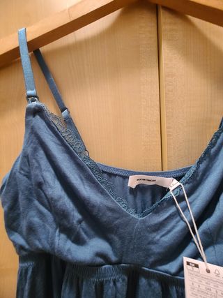 Camisa larga sin mangas, con detalle brillante borde superior. es larga hasta por encima de rodillas tipo camisón para llevar con pantalones debajo. Es PREMAMA pero también sirve como talla M-L normal , queda preciosa!