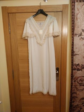 Precioso camisón hecho a mano con tela "plumetti" y cuello de ganchillo. Manga farol. Hecho por modista. Sisa 48cm. Largo desde la sisa 86cm. Sería una talla grande. Sin estrenar