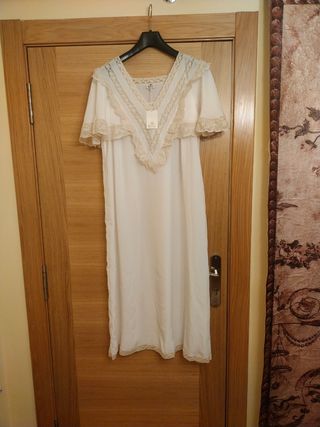 SIN ESTRENAR COLOR CREMA, bata camisón de CREPÉ DE Maripunto talla 3 Destaca lo bonito de los tirantes bordados Camisón de manga de tirantes Bata manga corta abotonada hasta el pecho No se realizan cambios de ropa