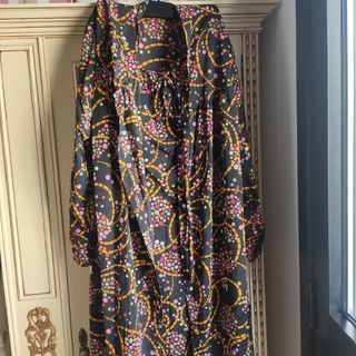 Camisón de manga larga con un bonito estampado floral en el cuello y los puños. Presenta botones en la parte delantera y un bolsillo. - Composición: 65% poliéster, 35% algodón. - Talla: 6. Equivalente a una M - Medidas: 1m de largo y 57 cm de ancho aproximadamente. - Interior de felpa. - Diseño con ribete floral. - Bolsillo en el pecho. - Está SIN ESTRENAR y en PERFECTO ESTADO. - Conserva su caja original.
