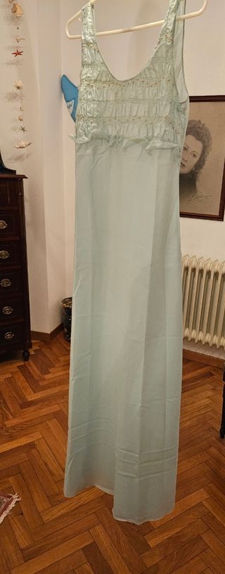 De color verde agua y fina lencería. Usado sólo en un ocasión. Tiene dos marchitas,una en la parte inferior delantera y otra en la trasera. Supongo que debido al tiempo que lleva guardado.No han salido con el lavado.