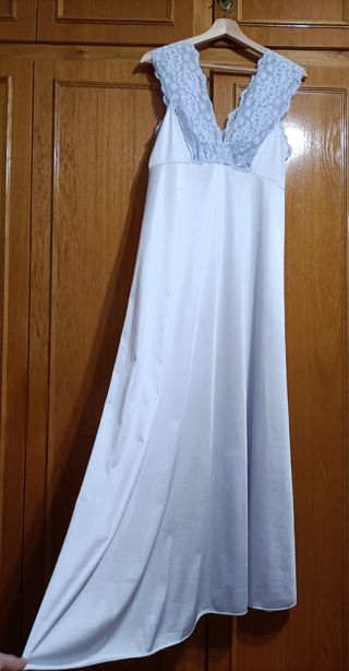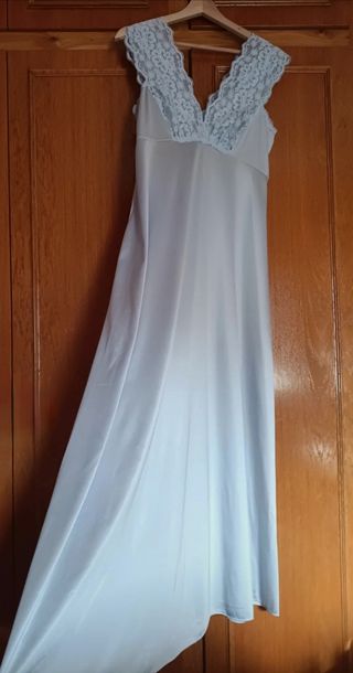 Precioso camisón o vestido lencero largo en tono azul claro, de la reconocida marca Vanity Fair, con un escote en V y un corpiño exquisitamente adornado con encaje floral. Su tela suave y brillante cae delicadamente, ofreciendo un ajuste cómodo y una silueta favorecedora, diseño elegante y femenino. Ideal para una noche especial, como prenda de dormir de lujo o incluso para un look boudoir o coquette si te atreves a combinarlo. Perfecto como camisón de noche, pieza de colección o incluso como prenda romántica para ocasiones especiales. Auténtica prenda VINTAGE de los años 70/80. Medidas en las fotos. - De sisa: 49cm - Largo: 136cm