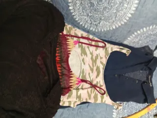 Conjunto de cuatro tops con un diseño coqueto y moderno. - Diseño con transparencias. - Estilo sexy y atrevido. - camisón azul transparente -mono multicolor de punto traslucido - jersey traslucido negro - camiseta camuflaje espalda descubierta parcialmente Unidad 2€ Todo 5€