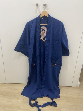 Elegante camisón playero de color azul con un llamativo bordado de dragón en la parte delantera. Incluye dos bolsillos con bordados de pájaros y una tira del mismo color para atar en la cintura - Bordado de dragón en el pecho. - Bolsillos laterales con bordado de pájaros.