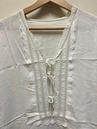 Camisón de chica con detalles de encaje. - Escote en V con cordones. - Mangas cortas con borde de encaje. - Bajo con aberturas laterales. - Tiene unas pequeñas manchas, se pueden ver en la foto 6 - Comprobar medidas en las fotos.