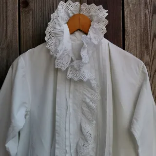 Elegante Vestido o camisón victoriano confeccionado en hilo, de color blanco roto, con un corte amplio y fluido que refleja la delicadeza de la época. La parte superior presenta mangas cortas con pequeños volantes y un cuello adornado con delicado encaje ingles Se cierra en los tirantes con dos botones originales de nácar, que aportan un detalle luminoso y auténtico. 📏 Medidas aproximadas: Pecho: 54 cm Longitud: 120 cm Talla estimada: 38/M amplia, tipo libre La prenda conserva señales del paso del tiempo, con algunas manchitas que forman parte de su encanto y carácter histórico. Una pieza única, ideal para coleccionistas,
