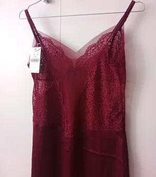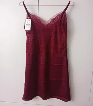 Este camisón tipo vestido lencero de Oshyo es una prenda delicada y elegante. - Cuerpo en satén - Diseño con encaje en la parte superior. - Talla M. - Tirantes finos ajustables. - Tejido suave y fluido. - Color burdeos - Colección lencería elegante de Oysho. Nuevo con etiqueta.