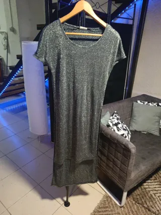 Camisón con un acabado metalizado que le da un toque brillante. Su diseño es versátil y cómodo. - Tejido con hilos plateados. - Corte recto y manga corta.