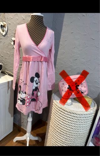 Pijama con estampado de Minnie Mouse. - Pijama de manga larga. - Detalle de cinta satinada en la cintura. - Incluye neceser a juego.( vendido) ❌ - Válido para talla S también.