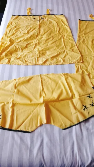 Camisón antiguo de color amarillo con un diseño de aviones. - Adornado con pequeños aviones bordados. - Presenta detalles de lazo en la parte superior. - Borde con acabado en negro.