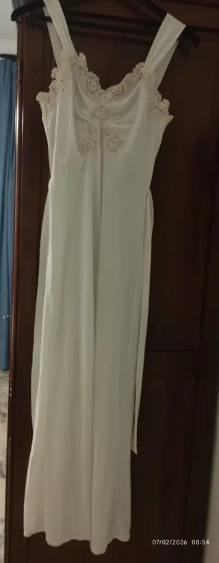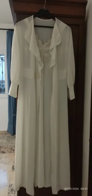 Color blanco nácar. Camisón talla 40 usado 1 vez. Medidas: largo 94 con tirantas, 74 sin contar las tirantas, pecho 80, cintura 82, caderas 100. Bata talla 42 sin estrenar. Medidas: largo 87, pecho 106, cintura 106, caderas 120. Especial boda.