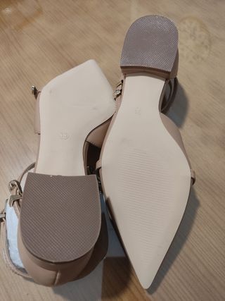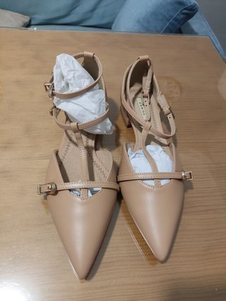 Elegante zapato de tacón con un diseño de tiras y hebilla. - Punta fina. - Tiras finas con cierre de hebilla. - Tacón de altura media. - Es de la talla 36 pero es más grande. Será la 37
