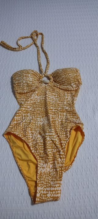 Bañador de una pieza con un bonito estampado. Escote regulable - Diseño halter con detalle de anilla. - Forro interior amarillo.