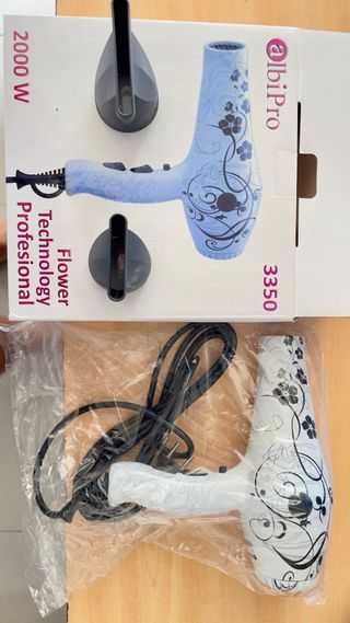Secador de pelo con un diseño floral en tonos blancos. Incluye dos accesorios. difusores - Potencia de 2000 W. - Diseño floral. - Incluye dos accesorios. se hacen envíos