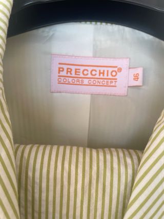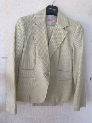 Conjunto de chaqueta y pantalón de la marca Preccio con un diseño de rayas verticales. - Chaqueta con un botón. - Bolsillos frontales en la chaqueta. - Diseño de rayas en tonos beige y verde.