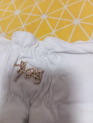 Pantalones vaqueros blancos con un diseño único y detalles brillantes. - Adornados con pedrería plateada. - Logo dorado de la marca en la cintura.