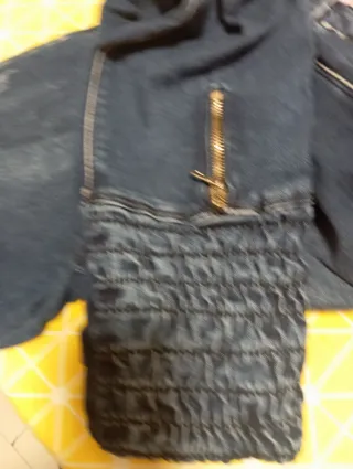 Pantalones vaqueros de mujer con un diseño moderno y detalles únicos. - Cremallera dorada decorativa. - Parte inferior con fruncido elástico.