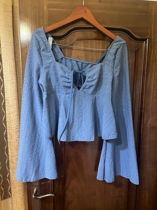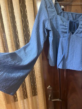 Este top crop presenta un diseño moderno y favorecedor. - Escote cuadrado. - Mangas largas acampanadas. - Detalle de lazada en el escote. - Tejido con textura y calados. - Corte peplum.