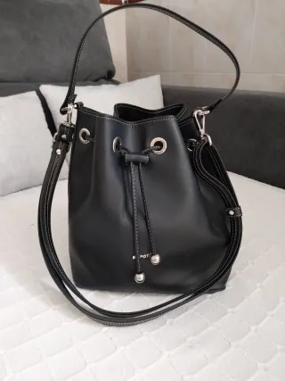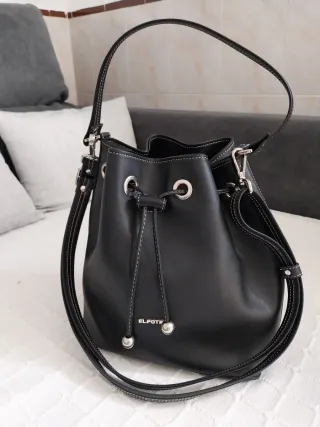 Bolso modelo cubo de la marca El Potro. - Color negro. - Cierre de cordón. - Detalle de pespuntes blancos. - Dos asas cortas y una larga ajustable.