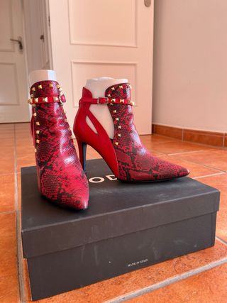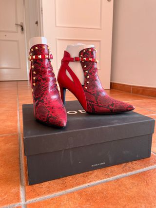 Botines rojos efecto serpiente - Talla 37 (NUEVOS) Vendo estos botines en color rojo con estampado de serpiente, totalmente nuevos y sin estrenar. Son de talla 37 y vienen con su caja original. Son muy cómodos, de alta calidad y perfectos para darle un toque llamativo y elegante a cualquier outfit. El precio original era de 185€, así que es una gran oportunidad. ¡Listos para estrenar y darle estilo a tus looks!
