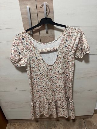 Vestido con estampado de flores y volantes en el bajo. - Manga corta abullonada. - Cuello redondo. - Bajo con volante. - Estampado floral.