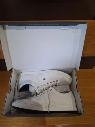 Zapatillas de la marca Tommy Hilfiger en color blanco. - Diseño clásico y versátil. - Cierre con cordones. - Detalle del logo de la marca. Están como se ven en las fotografías, prácticamente cómo nuevas.