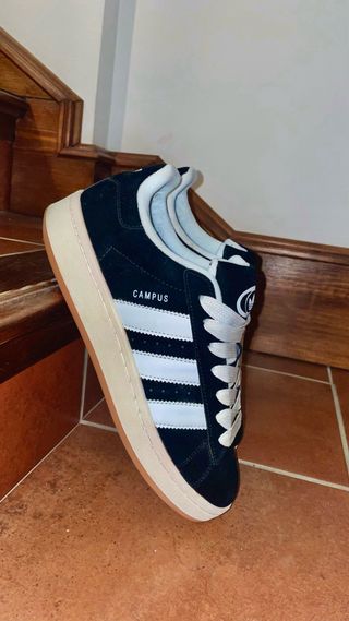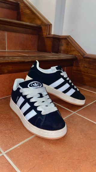 Zapatillas Adidas Campus en color negro con detalles blancos. Un clásico para el día a día. - Parte superior de ante. - Suela de goma. - Tres rayas icónicas de Adidas. Muy comodas y sin prácticamente uso