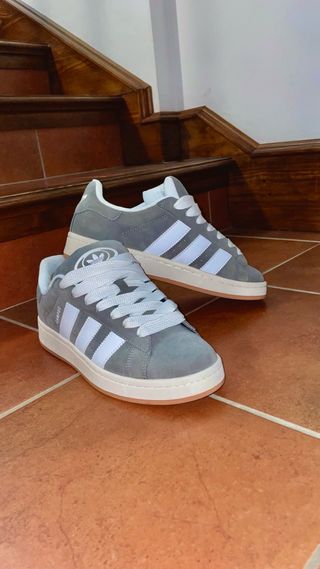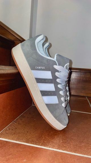 Zapatillas Adidas Campus en color gris y blanco. Un clásico atemporal. - Diseño con las tres rayas blancas. - Detalle de logo en la lengüeta. - Suela de goma. Sin prácticamente uso, muy cómodas