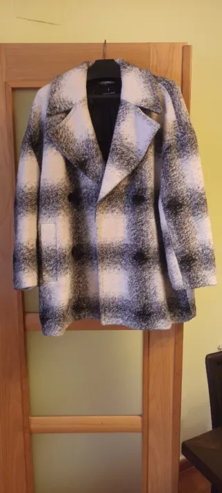 Abrigo de Stradivarius con un diseño de cuadros en blanco y negro. Es una prenda llamativa y versátil. - Diseño de cuadros. - Cuello solapa. - Cierre cruzado con botones.