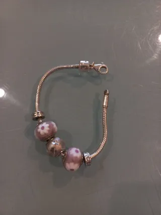 Elegante pulsera de plata con varios charms decorativos. Los charms presentan un diseño floral en tonos morados y un charm metálico con grabado. - Cierre de mosquetón. - Diseño de serpiente en la cadena. - Charms de cristal y metal.