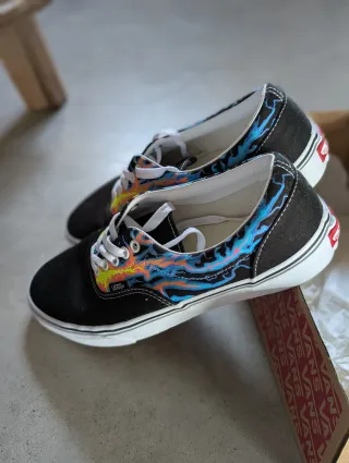 Zapatillas Vans con un diseño llamativo y colorido. - Descatalogadas. - Estampado de llamas multicolor. - Brillan en la oscuridad - Cierre con cordones blancos. - Logo de Vans en la plantilla. - Completamente nuevas con su caja