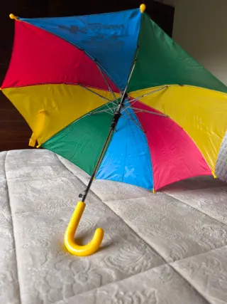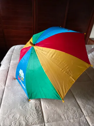 Paraguas para niños de Xabarín Club, mítico programa de la televisión de Galicia TVG. Material de merchandising muy raro y difícil de encontrar. Paneles de varios colores: azul, verde, rojo y amarillo. Señales de uso, pero en muy buenas condiciones todavía.