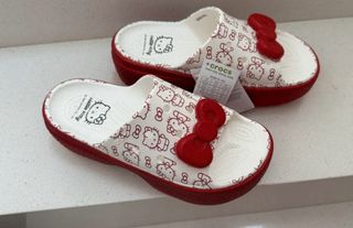 Zuecos Crocs Hello Kitty, edición especial 50 aniversario. - Diseño con estampado de Hello Kitty y lazos rojos. - Suela blanca con detalles de purpurina. - Borde exterior en color rojo.
