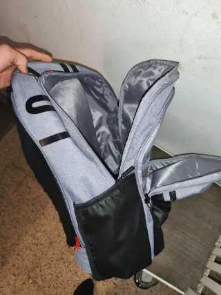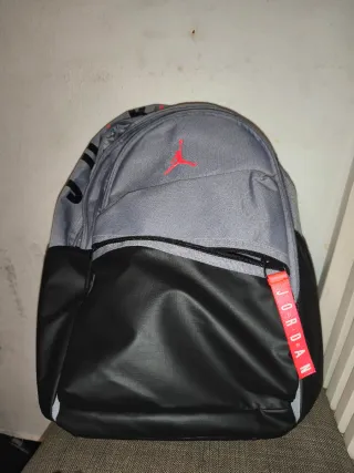 Mochila de la marca Jordan con un diseño moderno. - Color principal gris con detalles en rojo. - Logotipo de Jordan en la parte frontal.