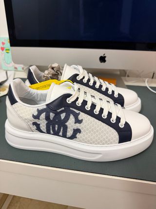 Zapatillas de la marca Roberto Cavalli con un diseño moderno y elegante. - Combinación de colores azul y blanco. - Detalle del logo de la marca en contraste.